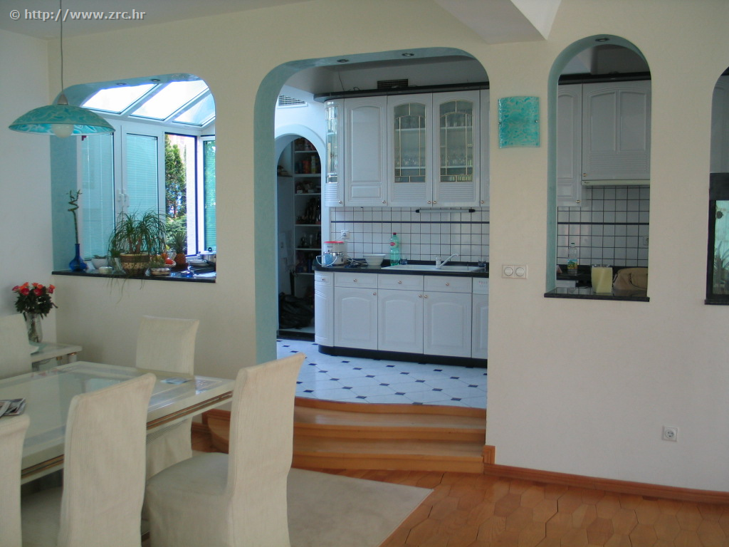 450 m2, moderno, ogromni dnevni boravak otvoren s blagovaonicom i kuhinjom i direktnim izlazom na terasu i veliki vrt, 4 spavaće sobe, dvije kupaonice, toalet, radna soba, vanjsi bazen, cage football, garaža, parking, mirno, lijep pogled.